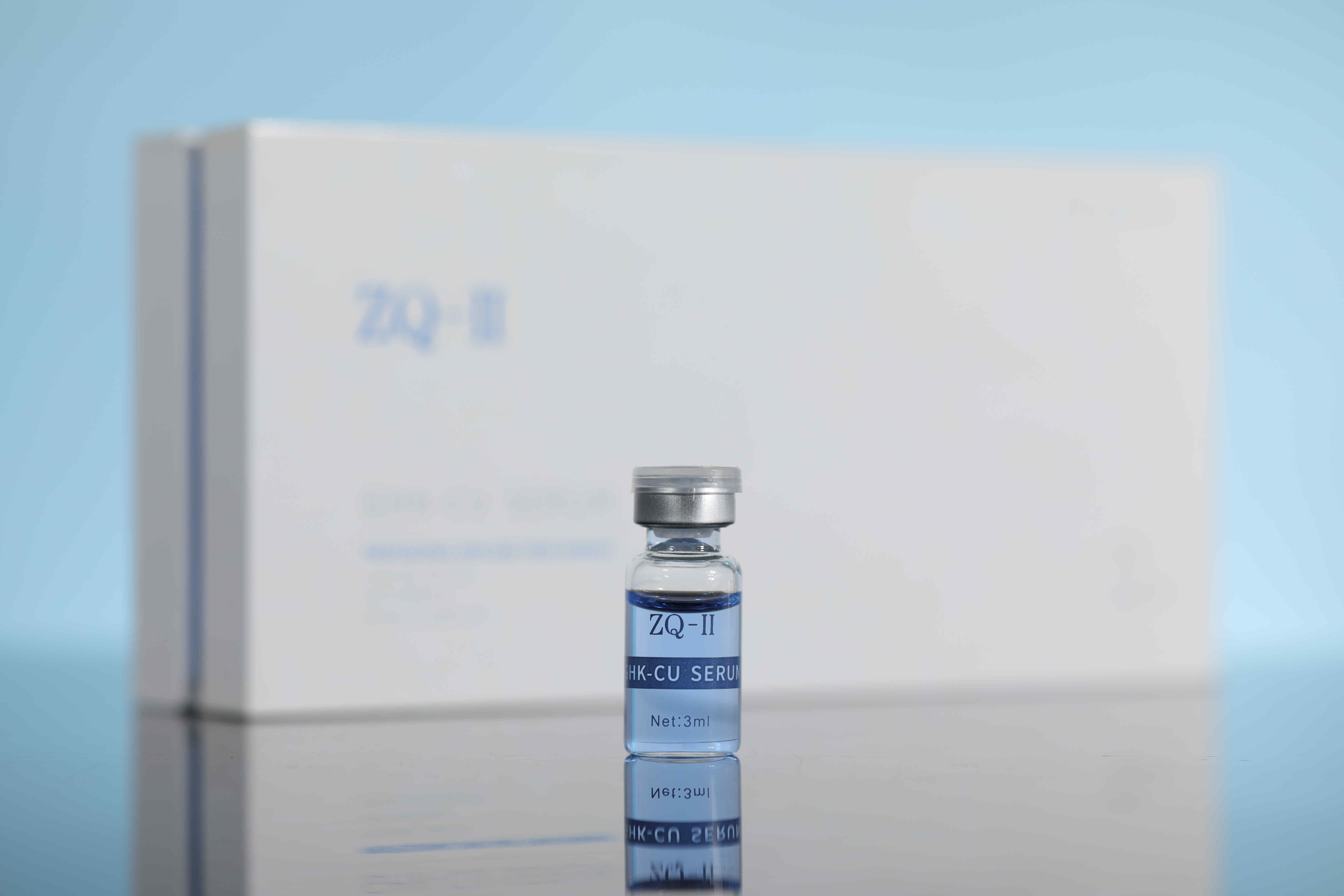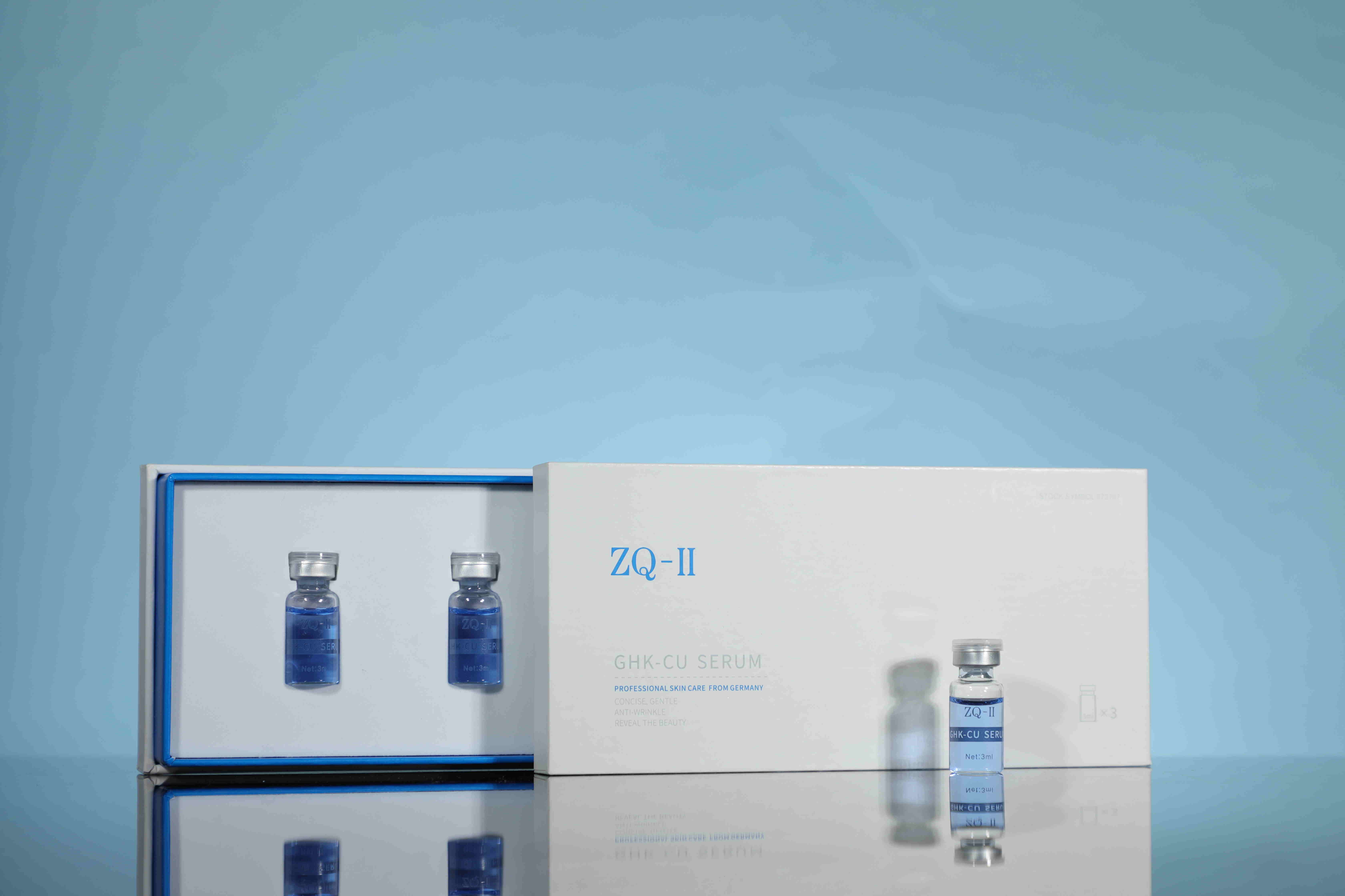 Warum heißen sie ""Kupferpeptide" oder "Blaue Kupferpeptide"Wenn sie mit Wasser gemischt sind, machen sie diesen wunderschönen blauen Farbton. Das ist die Magie von Kupferionen, die mit der Tripeptidstruktur verbinden.ZQ-II GHK-CU-Serum.
